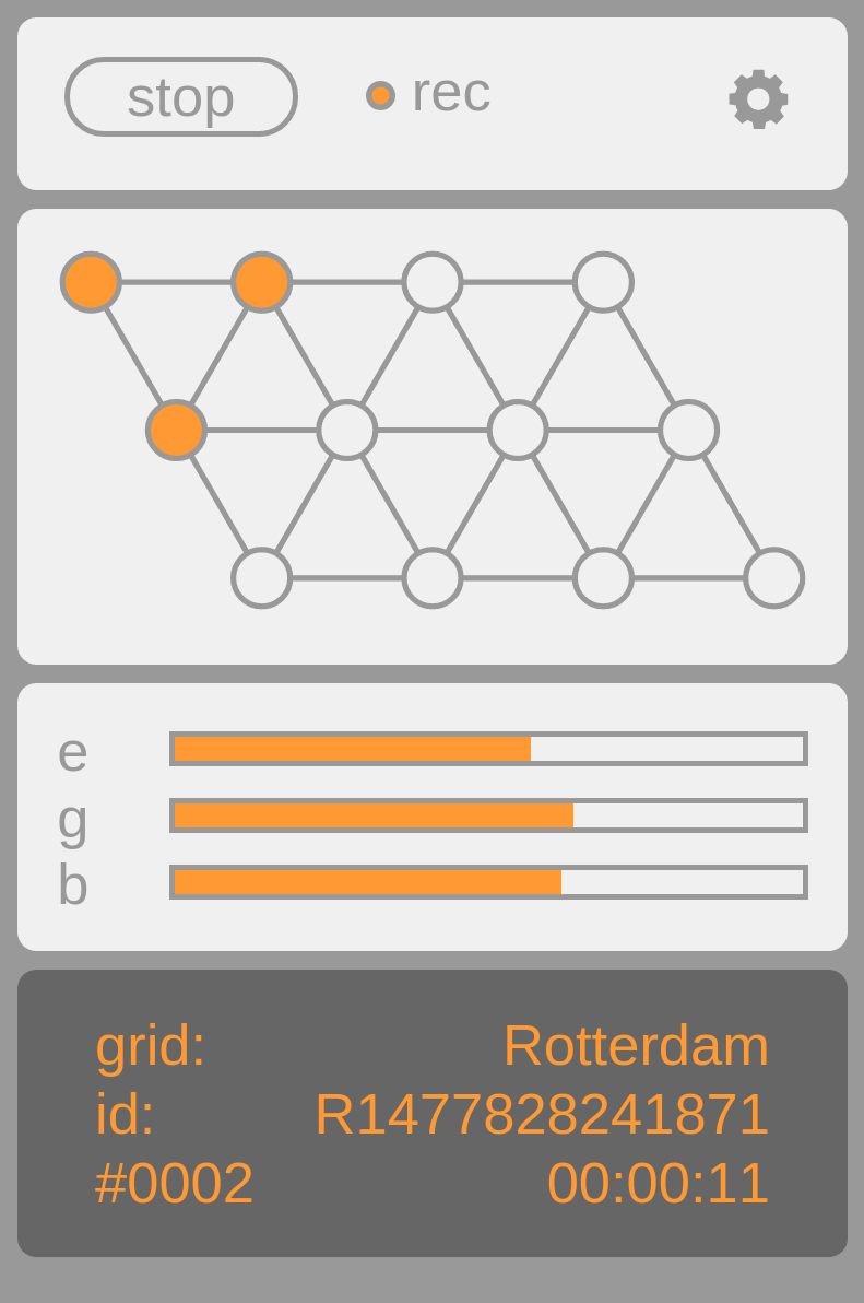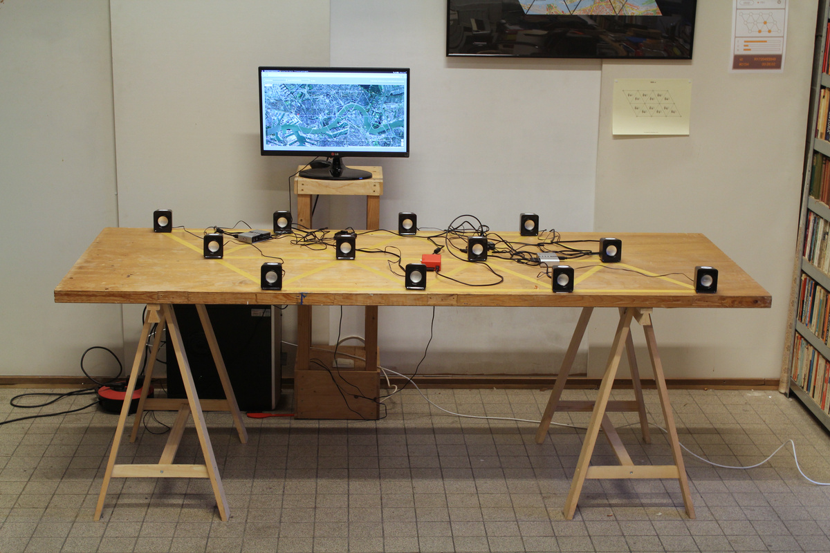 The player travels through the city carrying a phone with an app that at regular intervals reports its position to a server. This program determines which three points of the grid are closest to the player's position and plays those three tones. The monitor shows the current position of the player on a map. The volume of the individual tones is proportional with the distance to the corresponding points. The tones that are played are looped samples of my voice.
