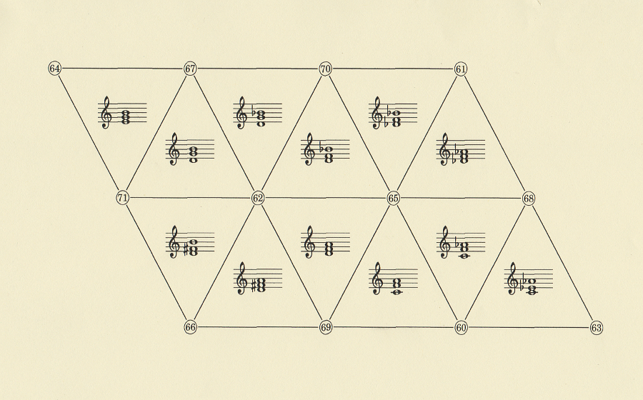 A grid of triangles is projected over the city. Each point of the grid is marked with a musical note. The twelve notes ofthe octave are laid out in such a way that each triangle forms either a major or a minor chord.